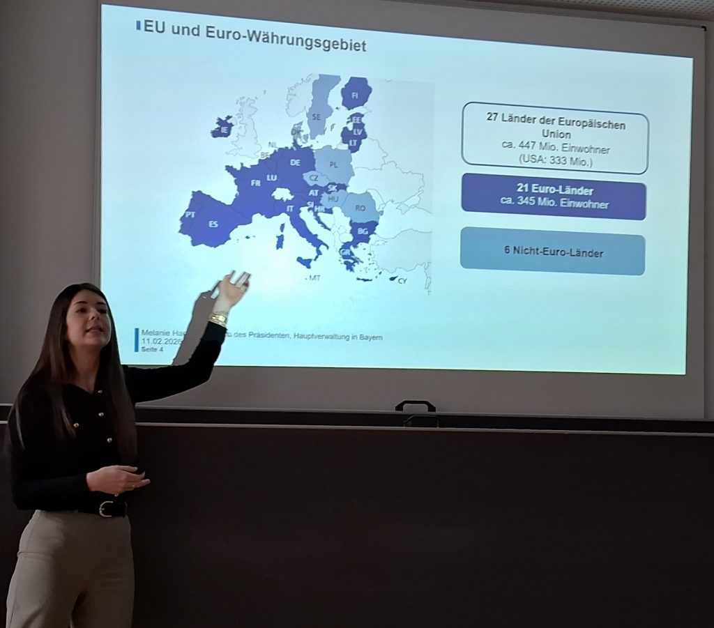 Im Rahmen ihrer Bildungsangebote besuchte uns auch dieses Schuljahr wieder die Deutsche Bundesbank, um ein Verständnis über geldpolitische Zusammenhänge zu vermitteln. Frau Melanie Hansmeier aus dem Stab des Präsidenten der Hauptverwaltung in Bayern hielt am 11.02.2026 einen interaktiven Vortrag für alle 12. Klassen der Ausbildungsrichtung Wirtschaft und Verwaltung zum Thema „Die Geldpolitik des Eurosystems“.