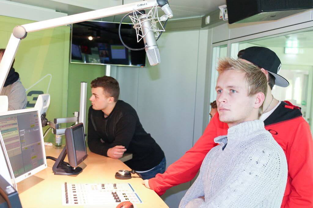 Die Seminargruppe „Schulradio“ von Frau Baumgart und Herrn Theil unternahm mit einigen externen Schülern des Wahlkurses „Film“ unter der Leitung von Herrn Klein diese Woche einen Kurztrip zum Funkgebäude des Bayerischen Rundfunks nach München. In den knapp zwei Stunden durften wir u.a. ein Sendestudio von Bayern 3 besuchen und einer Interview-Aufzeichnung mit der Moderatorin Christine Rose beiwohnen. Danach gings in die Studios, in denen Hörspiele aufgezeichnet werden. Das Ausprobieren der verschiedenen Requisiten dort sorgte für viele interessante Erlebnisse und Aha-Effekte. Zum Abschluss besuchten wir die Studios des neuen BR-Senders „Puls“, in denen gerade eine Live-Sendung ausgestrahlt wurde. Kaum zu glauben: Die gesamte Schülergruppe konnte während des Live-Aufsagers der Moderatorin zwei Minuten kein Wort sprechen. Fast wie im Unterricht… Ein wirklich lehrreicher Vormittag!